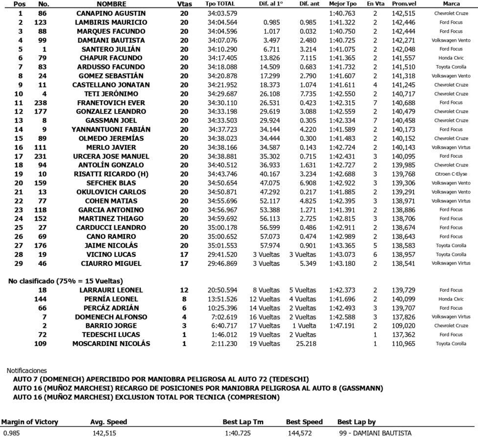“Ha sido un domingo perfecto. Ganamos sin que nos sobre nada, tirando todo. Facundo (Marques) tal vez tenía un poquito más que nosotros, pero el hecho de largar adelante y que no hubiera auto de seguridad nos benefició. No hice diferencias como en la serie porque esta vez no tenía autos con lastre detrás mío, como pasó con Chapur en la batería. Ahora tendremos kilos de lastre y hay que empezar a sumar, sin resignar la posibilidad de ir por la victoria”, contó Canapino en AM590 Continental y Campeones Radio.