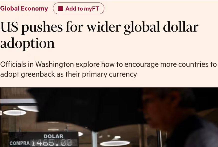 La publicación —con las firmas de Claire Jones, Amelia Pollard y Joseph Cotterill— sostiene que, bajo la consigna de “Paz a través de la fortaleza económica”, funcionarios republicanos exploran “cómo alentar a más países a adoptar el dólar como su moneda principal” y así fortalecer los lazos con gobiernos afines en la región y respaldar modelos de apertura y estabilidad monetaria, como el que impulsa Javier Milei.