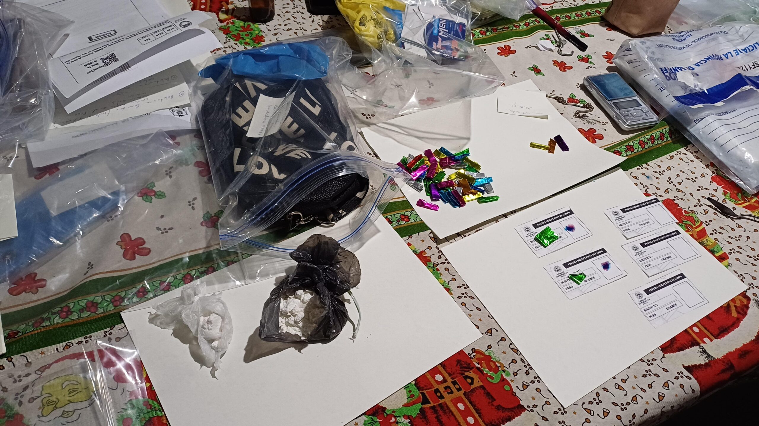 Además, en el lugar los agentes incautaron $327.300, 6 teléfonos celulares, 10 envoltorios con un peso total de 22.2 gramos de cocaína, 1 envoltorio con 10.6 gramos de cocaína, 1 envoltorio con 42.1 gramos de cocaína, 1 envoltorio con 2 gramos de marihuana y elementos de fraccionamiento.