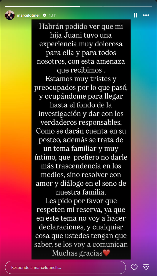 Juanita Tinelli sorprendió a sus seguidores al publicar un profundo descargo sobre la situación de angustia y estrés que estaba atravesando. En ese marco, quien también se pronunció fue su padre, el cual le mostró su apoyo.