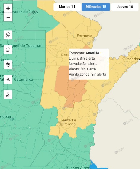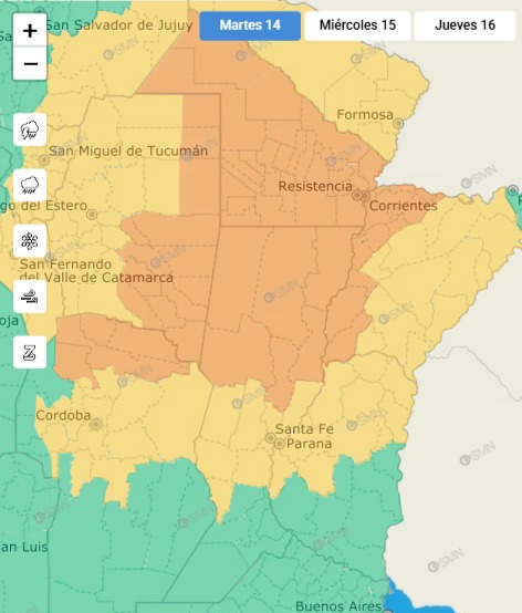 Para mañana miércoles, el SMN mantiene el alerta naranja para los departamentos Vera, General Obligado y San Javier; y amarillo para 9 de Julio, San Cristobal, San Justo, La Capital, Garay y San Jerónimo.