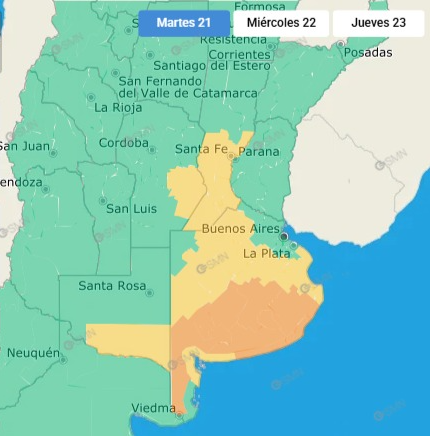 “El área será afectada por lluvias y tormentas aisladas de variada intensidad, algunas localmente fuertes. Las mismas estarán acompañadas por abundantes precipitaciones en cortos periodos, actividad eléctrica frecuente, posible granizo, y ráfagas que podrían alcanzar los 70 km/h. Se estiman valores de precipitación acumulada entre 40 y 80 mm, que pueden ser superados en forma localizada” señala el informe oficial.