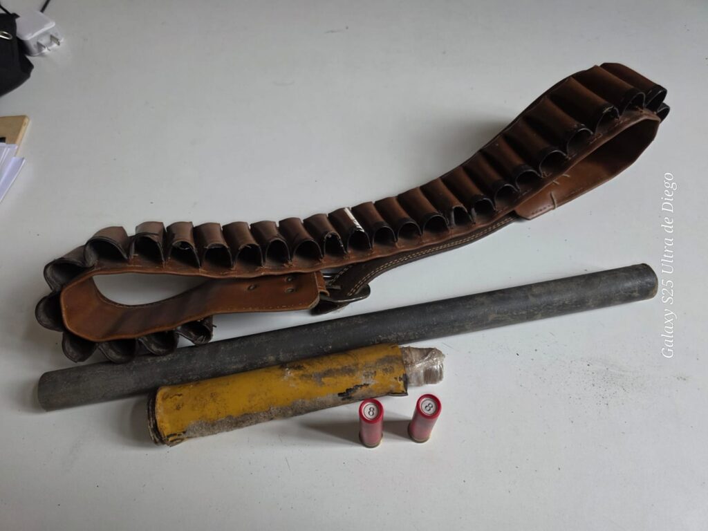 Con los datos aportados, se realizó un rastrillaje por la zona y minutos después se logró la aprehensión del imputado. Durante el procedimiento se secuestró una escopeta tipo tumbera compuesta por dos caños —uno de aproximadamente 20 centímetros con tapón de madera y otro de unos 50 centímetros—, dos cartuchos de escopeta, un porta cartuchos de cuero y una motocicleta Motomel 150 cc de color rojo y blanco.