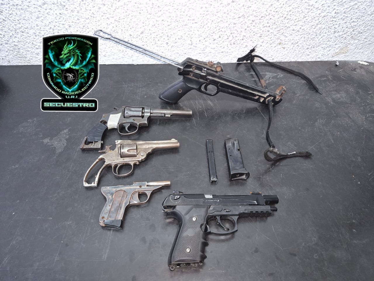 Los agentes llegaron hasta el lugar comisionados por la Central del 911 y pudieron secuestrar un revólver calibre 38 corto, con municiones; un revólver 38, con municiones percutadas; una pistola calibre 22 con un cargador sin municionar; una réplica de arma de aire comprimido; una ballesta; y un cargador de pistola marca versa con capacidad de 13 municiones.
