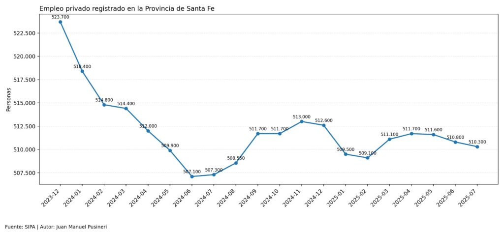 El Sistema Integrado Previsional Argentino (SIPA), proporcionada por la Secretaría de Trabajo de la Nación, informó que el empleo privado registrado en julio en Santa Fe experimentó una nueva caída respecto del mes anterior, prolongando la situación de “meseta” que se verifica desde la segunda mitad del año pasado. Con estacionalidad se contabilizaron 510.300 empleos, es decir 500 menos que el mes anterior.